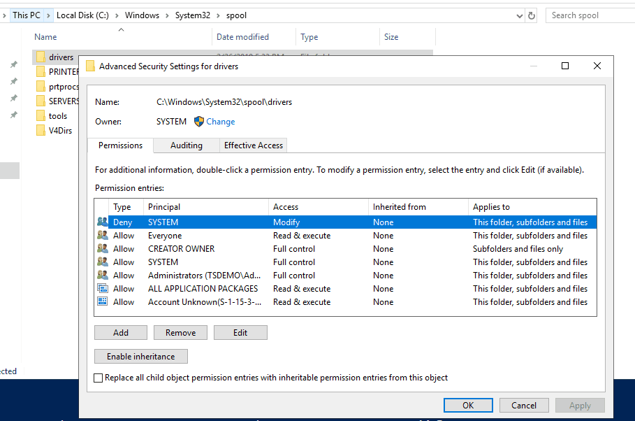By restricting the ACLs on this directory (and subdirectories) we can prevent malicious DLLs to be introduced by the print spooler service.