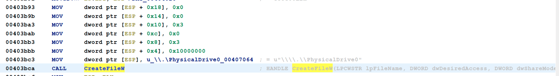 For the code itself there is only one interesting part, and that is the part of destroying the Master Boot Record. That is first done by using CreateFileW with the first parameter set to PhysicalDrive0 to access the Master Boot Record.