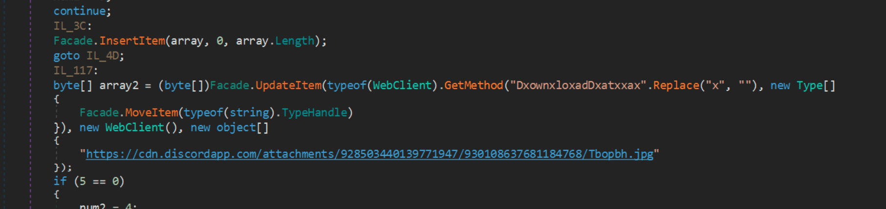 The malware applies some simple obfuscation on the DownloadData method by adding “x” into the string and then removing them. It mimics the download of a JPG file, that in fact is a DLL file.