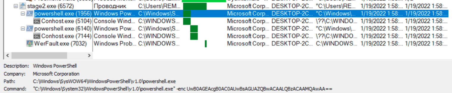 Upon execution the malware starts two instances of PowerShell with base64 encoded parameters.