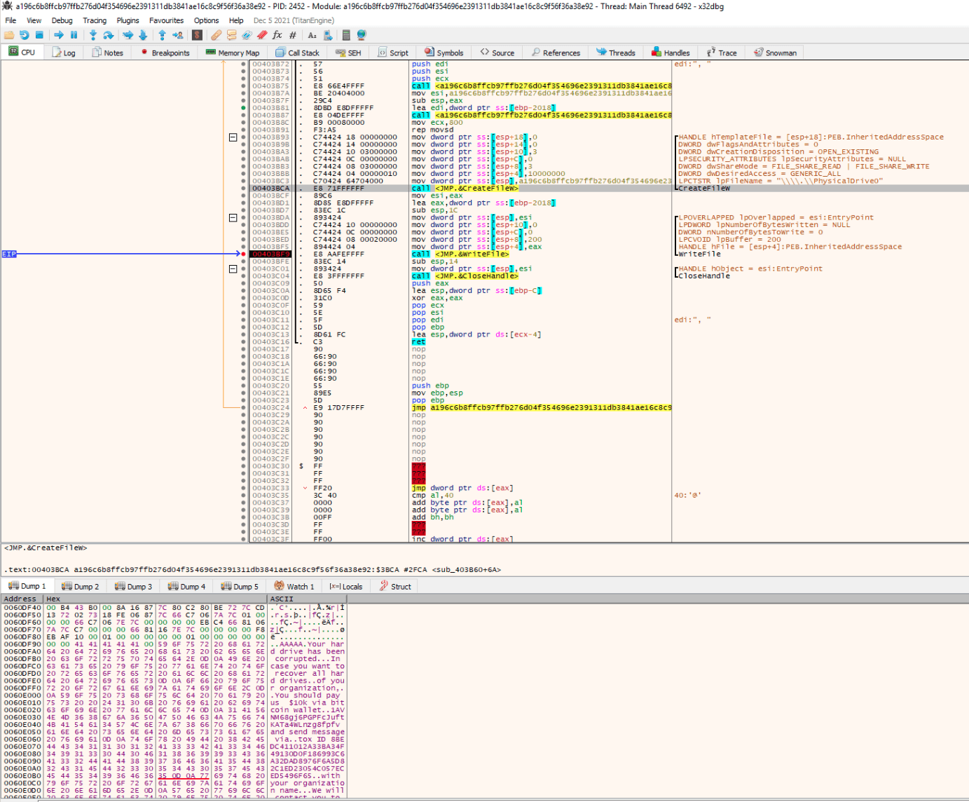 After gaining access to the file, the “encryption” message “Your hard drive has been corrupted…” is stored in register EAX and written to the file, with a buffer of 512 bytes (0x200).