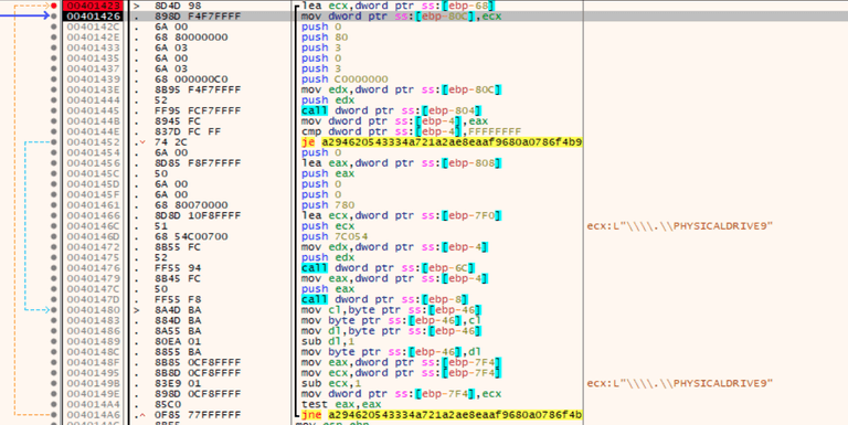 Lastly the wiper loops through a list of open raw access to \\.\PHYSICALDRIVE9 – \\.\PHYSICALDRIVE0 and writing to it using IOCTL_DISK_SET_DRIVE_LAYOUT_EX (0x7c054) by using the API DeviceIoControl. By doing so it erases the Master Boot Record.
