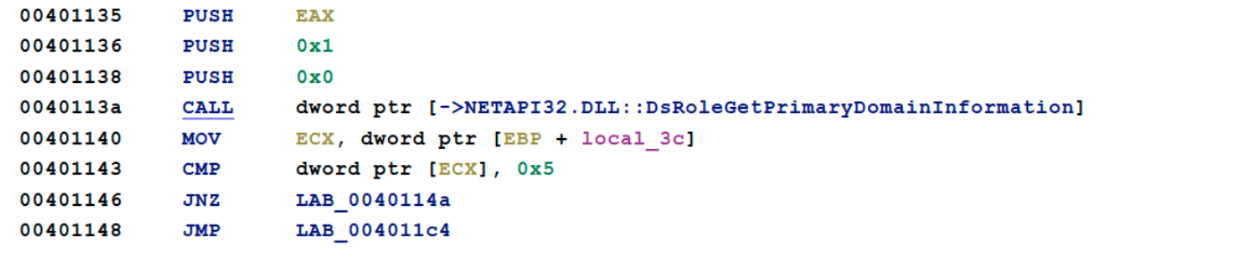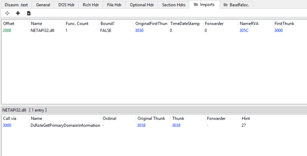 Looking at the Import Address table, there is only one function called, DsRoleGetPrimaryDomainInformation, indicating that there are more functionalities in the malware that are hidden from static tools.