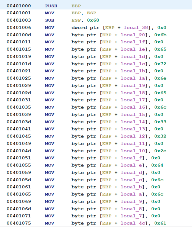If the sample is opened in a disassembler, in this case Ghidra, it can be seen that it uses a lot of stack strings for obfuscation.