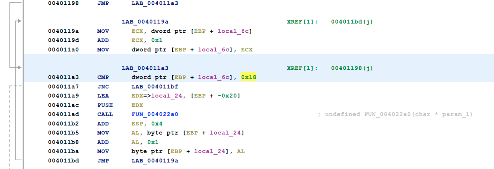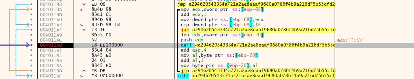 Then the wiper loops through the alphabet (0x18), starting with D all the way up to Z and then one additional iteration, and applies the data destruction from the function in 0x4022A0 to the files in every partition it finds.