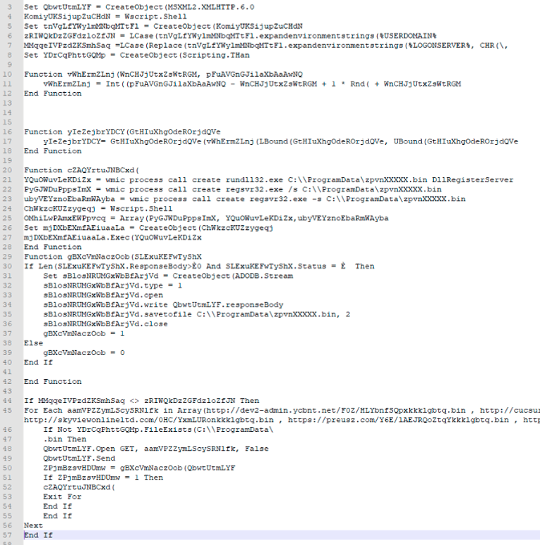 If the computer is connected to a domain a DLL is then downloaded, to C:Programdata, and wmic runs it using rundll32 and register it as a service with regsvr32. The vbs script looks like this after deobfuscation