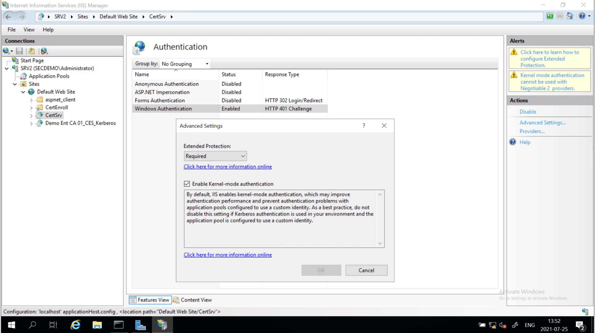 - Disable/remove the NTLM provider in the Internet Information Services (IIS) running the selected role services.